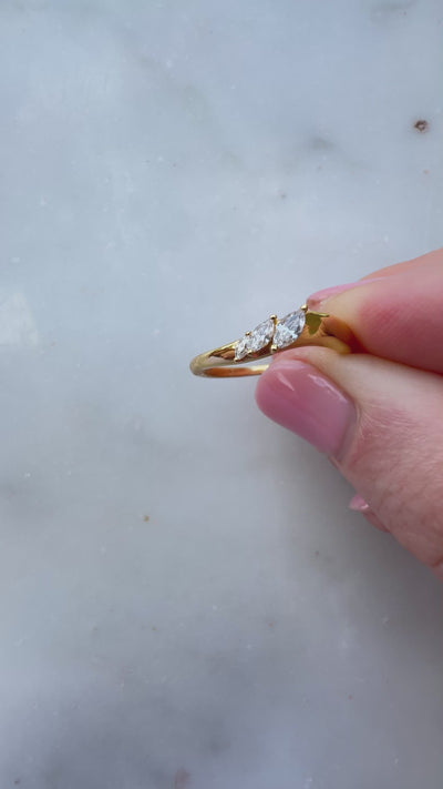 A timeless trio of zircons set on a sleek, tapered band. Crafted in sterling silver with 18k gold vermeil, the Sarina Ring is a delicate statement of love, elegance, and everyday sparkle.